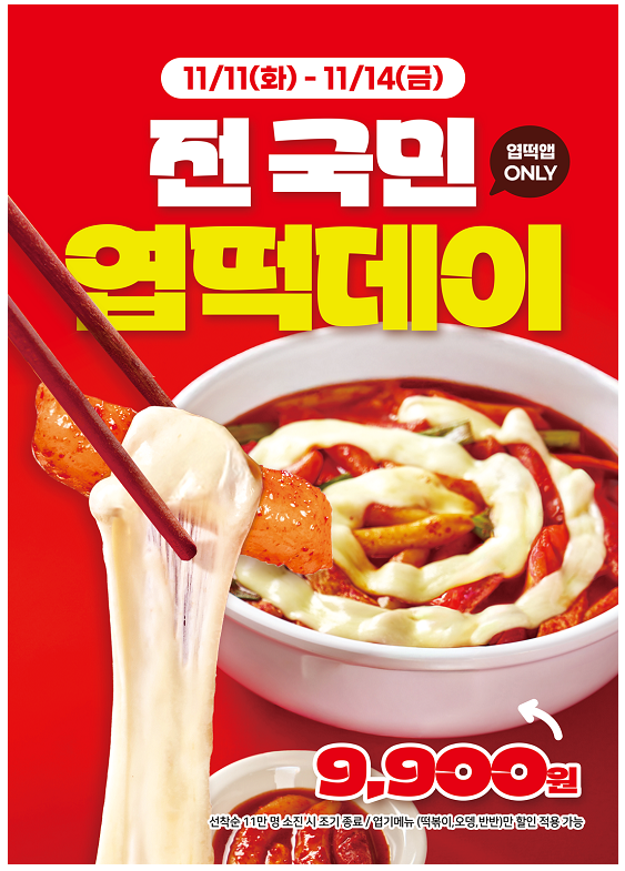 전국민 엽떡데이 2025 이벤트: 엽떡앱 회원 선착순 11만명 대상, 엽기메뉴 전부 9,900원! (행사기간: 2025.11.11 ~ 2025.11.14)
